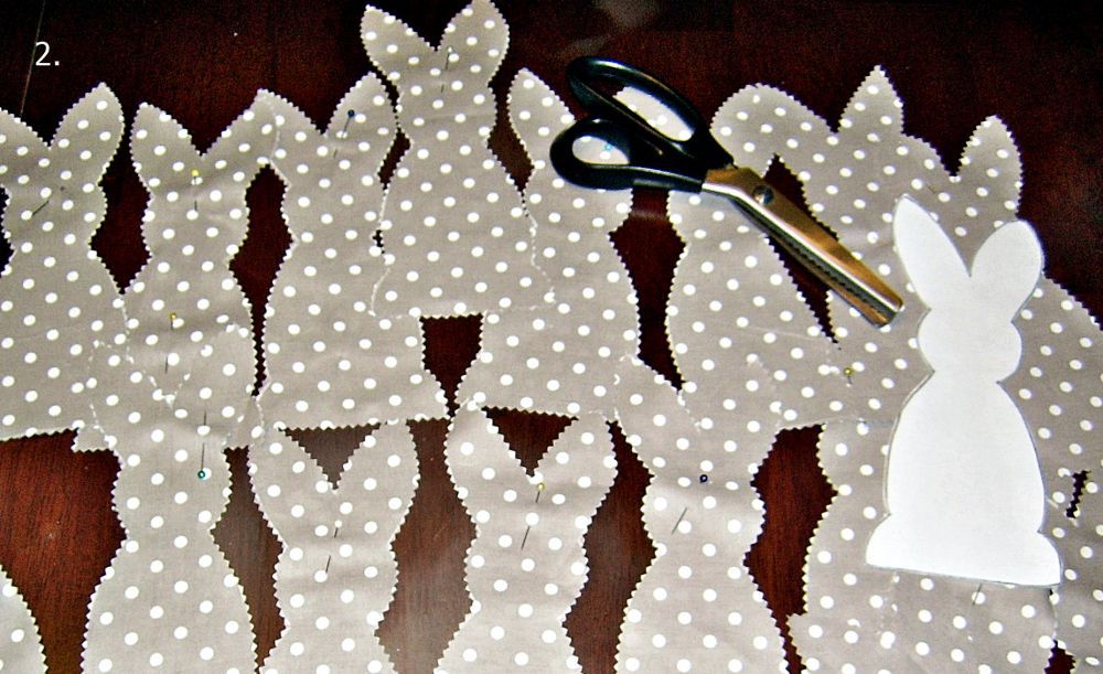 2. Cikk cakk ollóval körbevágtam az anyagra rajzolt nyuszikat: pontosan 21-et. És itt a magyarázat is, hogy miért ezt a mintát választottam. A cikk cakk olló megoldja az anyag szélének eldolgozását és még jól is mutat.
