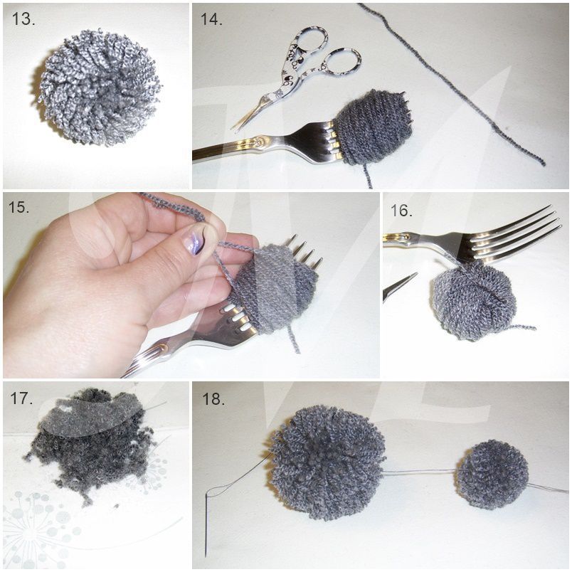 14: Mivel a nyuszi fejét ugyebár nem szeretnénk ekkorára ezért annak elkészítéséhez két módszert is tudok ajánlani. A egyik, hogy ennek a pomponnak az elkészítéséhez csak két ujjadra tekered a fonalat, a másik pedig a villás módszer. Itt se sajnáld a fonalat mert a tömött pompon szebb és könnyebb is vele dolgozni.